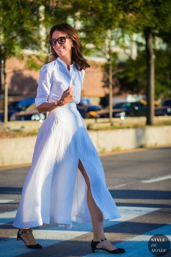 T恤是夏天出镜率最高的单品,简单舒适的T恤加上材质轻盈的开衩裙,走起路来摇曳生姿。