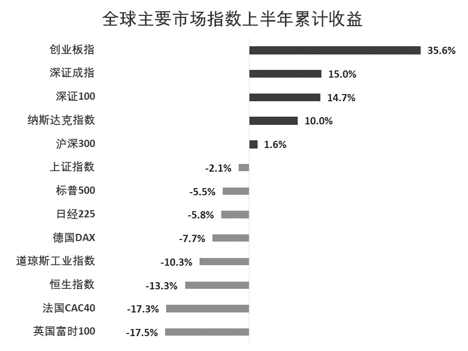 路透社称,全球股市今年迄今跌近9%,并创10年最差开局。在业2020年上半年,中国A股成为表现最好的市场之一。深交所旗下深圳证券信息有限公司提供的信息显示,今年上半年,创业板指已经累计上涨35.6%,大幅领跑全球主要市场指数。另据美国CNBC网站1日报道,当地时间周二,欧洲STOXX 600指数收盘创下2015年3月以来的最佳季度,自4月初以来已上涨12.59%。但欧洲股市的表现仍被美国股市超越,标普500指数第二季度上涨19.95%。
