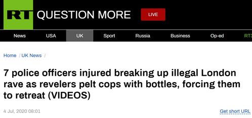 [环球网报道 见习记者 崔妍]据“今日俄罗斯”(RT)4日报道,当地时间3日晚,伦敦白城地区有多人聚集,在未经允许的情况下举办“街头音乐节”。报道称,当地警方在试图驱散人群时被示威者追赶围攻,导致7名警察受伤。