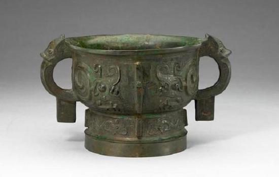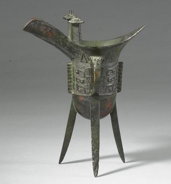 此爵有着卵形底,腹部装饰兽面纹。器足修长,且口部呈两端上扬的圆弧状,再搭配耸立的菌形立柱,显得优美均衡。