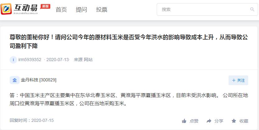 对此,金丹科技回应称,“中国玉米主产区主要集中在东华北春玉米区、黄淮海平原夏播玉米区,目前未受洪水影响。公司所在地周口位黄淮海平原夏播玉米区,公司在当地采购玉米。”