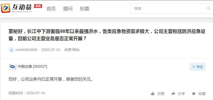中新经纬客户端注意到,有几家防汛应急设备生产商受到投资者关注。一名投资者提问中船应急,“公司主营包括防洪应急设备,目前公司主营业务是否正常开展?”中船应急给出肯定答复,并称“公司24小时开足马力全力支持抗洪抢险”。