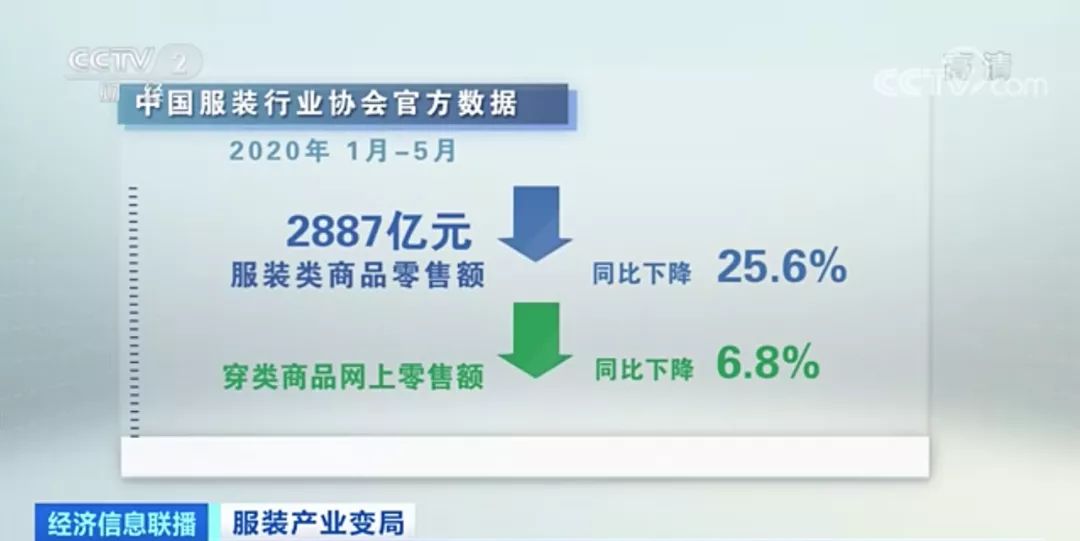 来自中国服装行业协会官方数据,2020年1-5月,我国限额以上单位服装类商品零售额累计2887亿元,同比下降25.6%,穿类商品网上零售额同比下降6.8%。