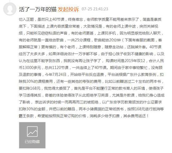 [环球网教育报道]由于受到疫情影响,今年上半年在线教育的关注度及使用率不断攀升,然而伴随而来的相关投诉量也激增。近日,央视在报道教育培训乱象中点名了一些教育机构存在的“退费难、虚假宣传及课程质量差”等问题。其中,在线英语培训机构—阿卡索就被消费者投诉外教老师无故迟到、上课玩手机及经常“掉线”等诸多问题。