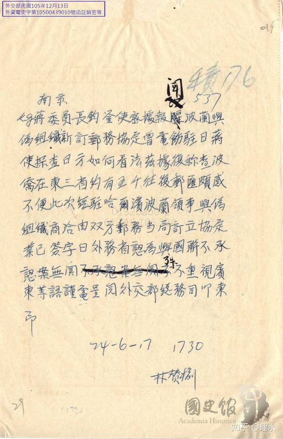 10月11日,驻英公使郭泰祺致电“蒋公”,指出:彼波兰政府对取消承认伪满事,迄未允许,故派使事因之搁置。日前因驻日波使被逐出境,认为取消承认伪满应不复成问题,故又电顾大使与波方洽商,尚未得到复电。如波政府果有意以前驻日大使使华,我方自可予以同意。已电顾大使再与波方洽商矣。