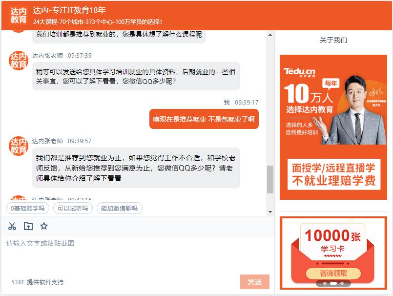 在交款之前,达内的官网承诺保就业,不就业就全额赔付学费。“我当时截了官网的截图。今天去他们官网,已经不那么说了。”王辉说,“现在课上完了,我没有找到新工作,学的东西也没什么帮助,之前的工作也耽误了,还要还贷款……”