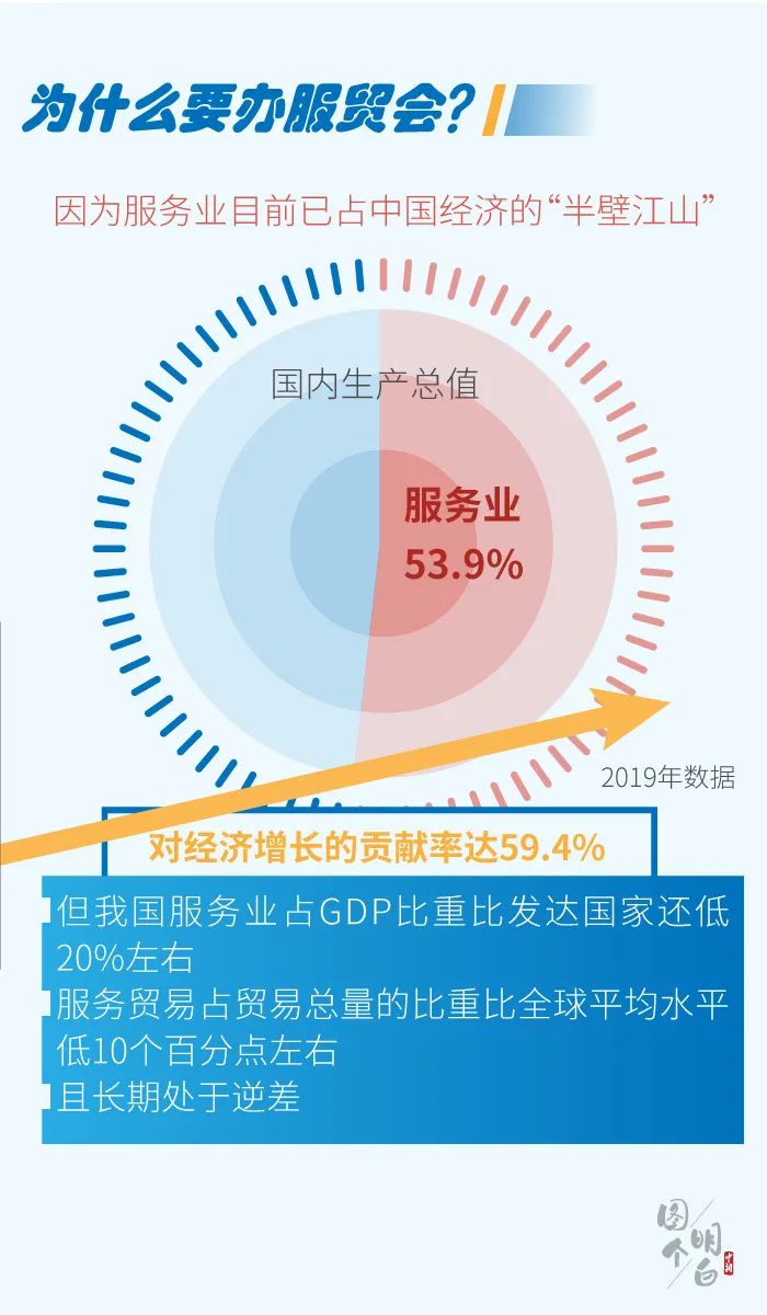 因为服务业目前已占中国经济的“半壁江山”。2019年,服务业增加值占国内生产总值的比重已达53.9%,对经济增长的贡献率达59.4%。但我国服务业占GDP比重比发达国家还低20%左右,服务贸易占贸易总量的比重比全球平均水平低10个百分点左右,且长期处于逆差。
