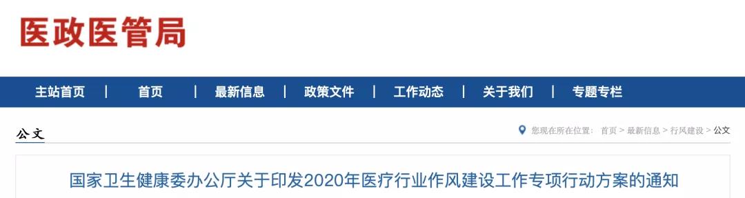 日前,国家卫健委发布了《2020年医疗行业作风建设工作专项行动方案》,这次方案的重点就是规范医疗机构及其从业人员行为,印发给各省、自治区、直辖市及新疆生产建设兵团卫生健康委,开始组织实施。