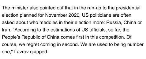 拉夫罗夫随后提到,美国总统大选马上要在11月3日举行,一直以来,美国政界人士经常被问及谁对他们的选举干预更多:俄罗斯、中国还是伊朗,“据统计,到目前为止,中国在这场比赛中排名第一。当然,我们也很遗憾得了第二名,因为我们已经习惯了当第一名。”拉夫罗夫打趣地说到。