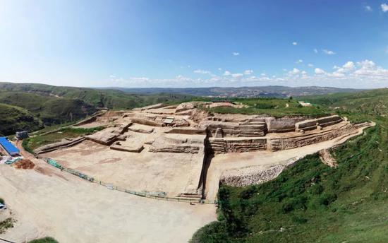石峁遗址地处晋陕高原北端,黄河西岸,兴建于4300年前。石峁城址以皇城台为核心,内城墙和外城墙呈半包围状将“皇城台”环抱,是中国已知规模最大的龙山时代晚期城址。城内密布着大量宫殿建筑、房址、墓葬、手工业作坊等遗迹现象。经过多年考古发掘,出土了陶器、玉器、骨器、铜器、壁画、纴木和石雕等大量重要遗物。种种迹象表明,石峁遗址是其时中国北方区域政体的中心,已经跨入了邦国都邑的行列之中。