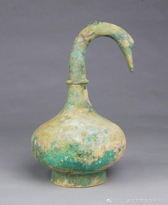 三门峡被誉为“天鹅之城”,每年都有近万只白天鹅自西伯利亚迁徙到当地的黄河湿地过冬。鹅首曲颈青铜壶的出土,为这一美名增添了文化底蕴。