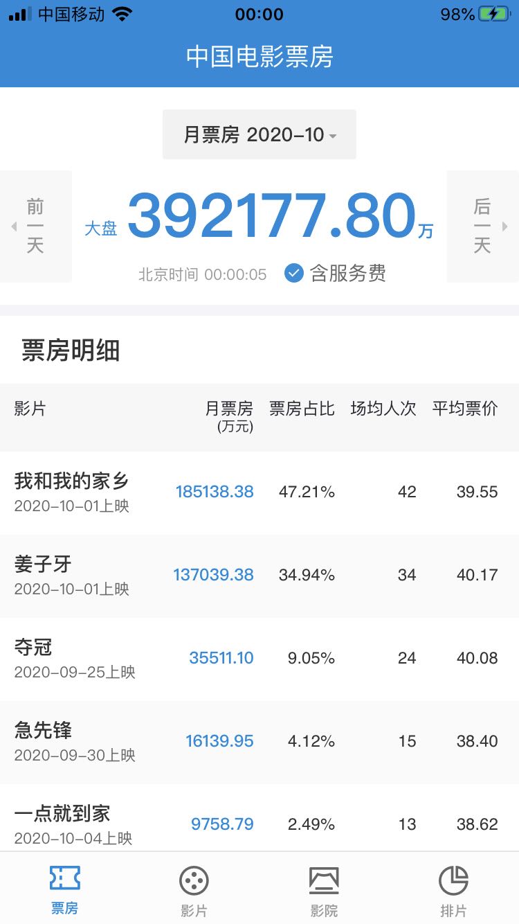 2020年国庆档(10月1日-10月8日)落下帷幕,据国家电影专项资金办公室“中国电影票房APP”数据显示,截至10月8日24时,2020年国庆档票房达39.2亿元,取得中国影史国庆档票房第二的成绩。