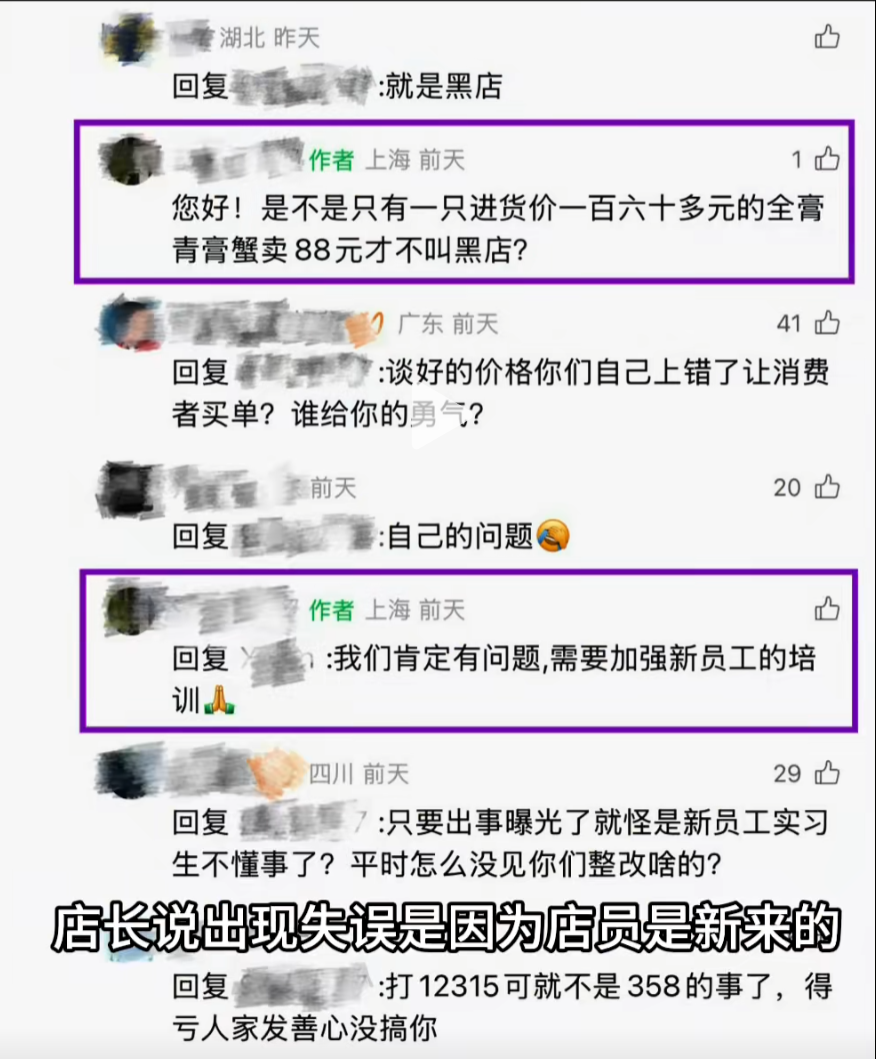 据宝女士发布的视频,该店店长在评论区回复称膏蟹进货价就要160多元,并称出现失误是新员工培训不到位的原因。