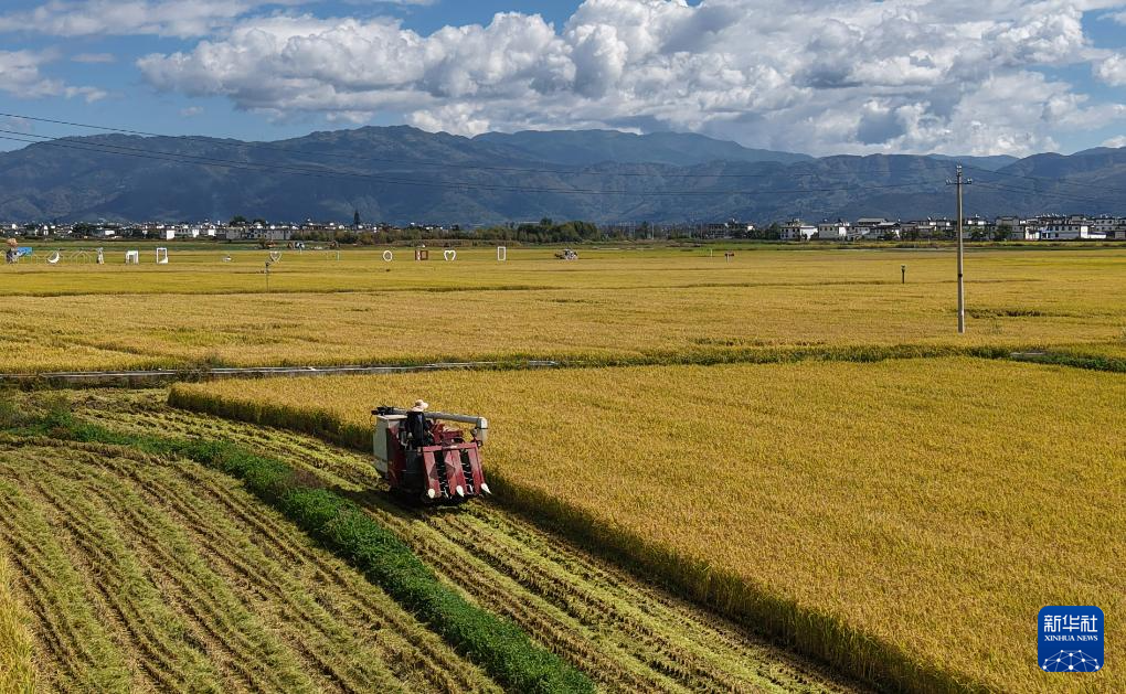 10月10日,工人在云南省大理市喜洲镇水稻种植基地收割水稻(无人机照片)。 据农业农村部最新消息,截至10月10日,全国秋粮收获已过五成。 新华社发(梁志强摄)