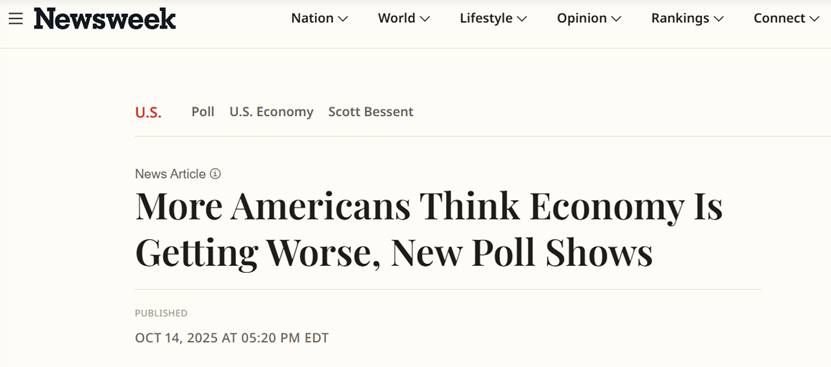 《新闻周刊》认为这一数据反映了公众对政府关门、通胀忧虑和党派分歧的担忧。经济减速、消费者信心下降、裁员、高通胀和贸易战等多重因素影响了经济前景,尤其是中低收入群体承受压力增大。