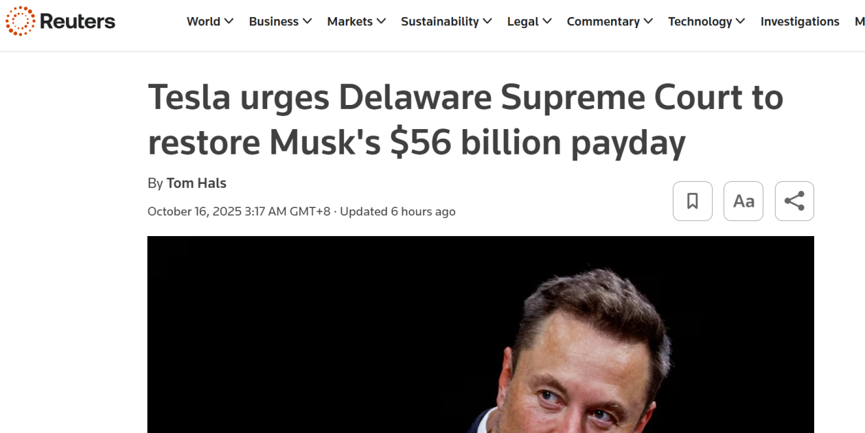 【环球网科技综合报道】10月16日消息,据路透社报道,特斯拉公司近日针对首席执行官埃隆·马斯克价值560亿美元的薪酬方案,向美国特拉华州最高法院提起上诉。这是该方案在两次获得股东投票支持却遭特拉华州衡平法院否决后,特斯拉为推动方案落地所做的又一重要举措。