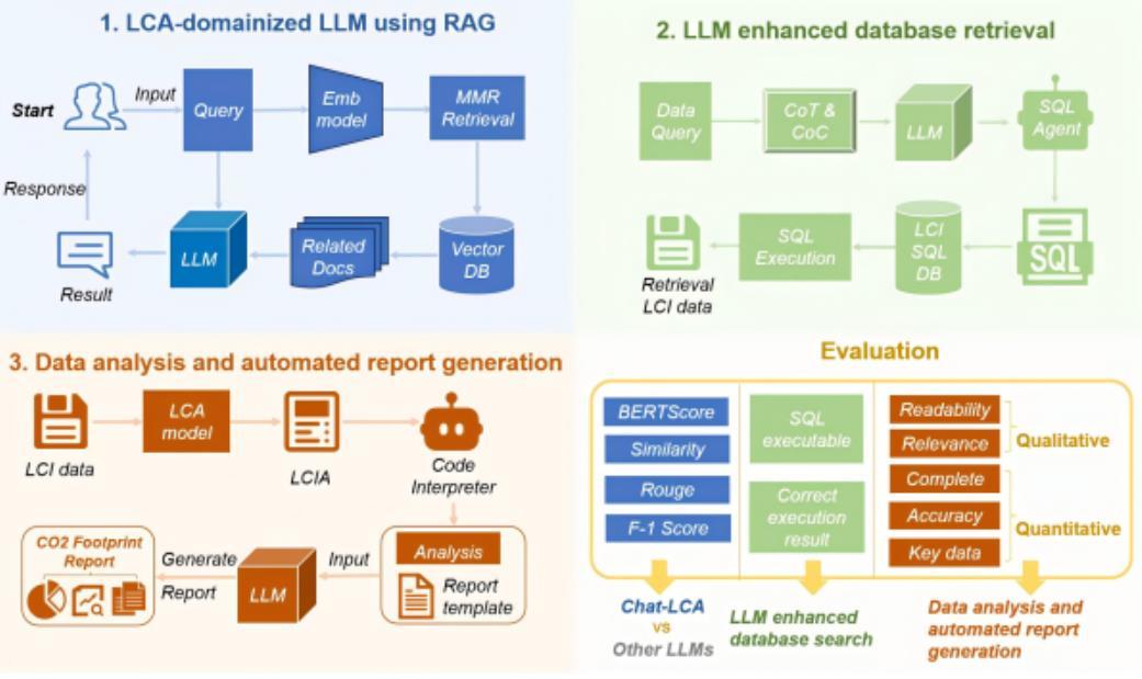 Chat-LCA系统实现了LLM在“知识获取—数据检索—报告生成”全链条的深度融合,显著提升了碳核算的智能化水平。该研究的原创性体现在首次将检索增强生成(RAG)、Text2SQL、思维链(CoT)与代码链(CoC)等前沿AI技术系统整合于LCA全流程,构建了支持自然语言交互的一体化碳核算智能系统。Chat-LCA有效打通了知识壁垒与数据孤岛,实现了从专业问答到报告生成的全流程自动化,突破了现有研究中技术覆盖片面、环节割裂的局限。