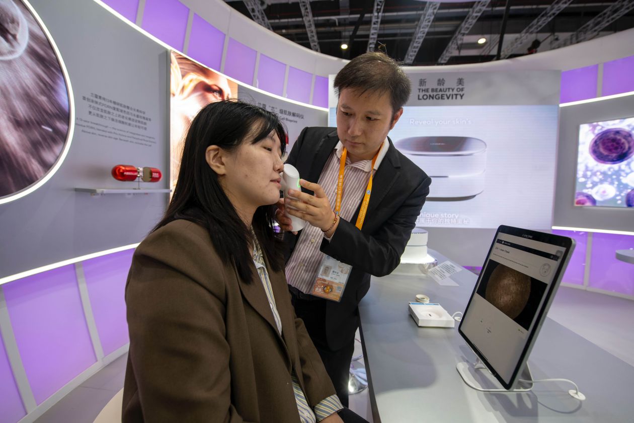 在第八届进博会消费品展区的欧莱雅展台,参观者正在体验中国首秀产品SkinConnect微镜,对脸部皮肤进行全面检测。人民网记者 翁奇羽摄