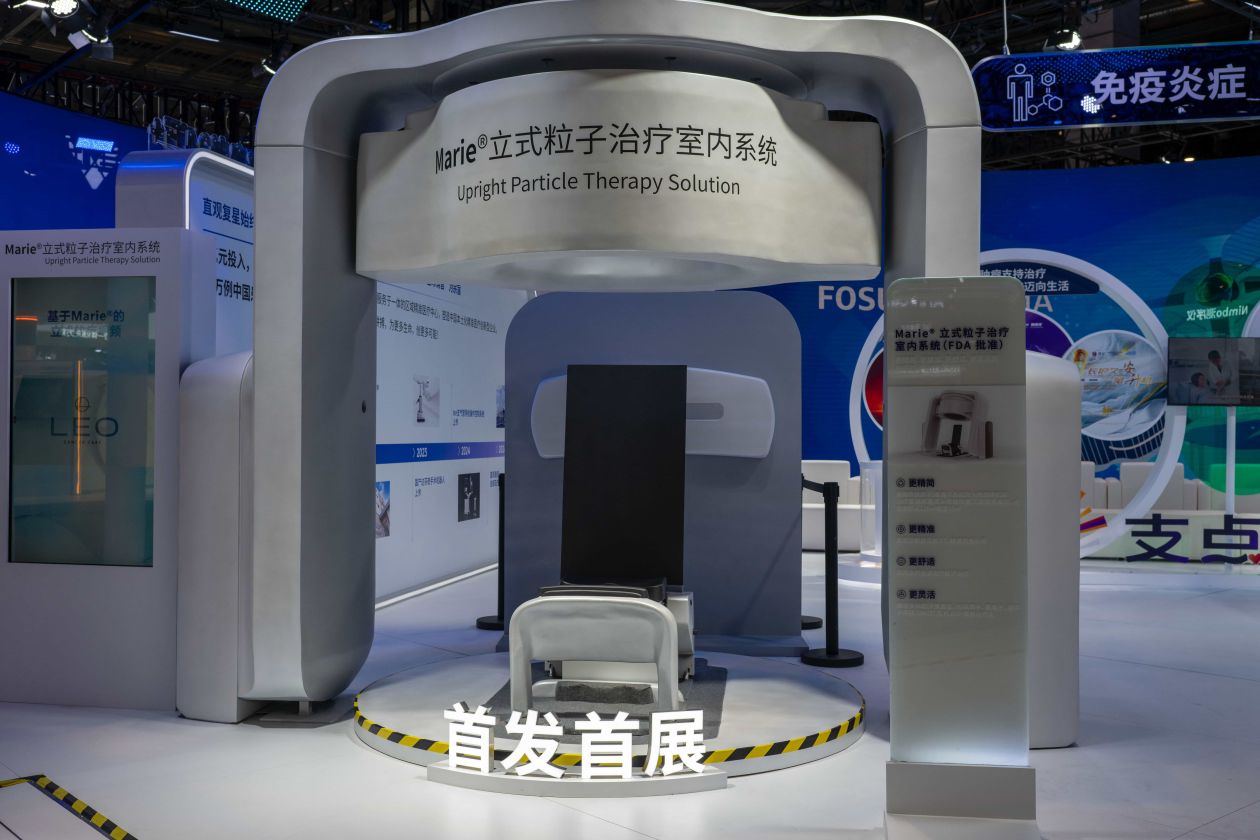 在第八届进博会医疗器械及医药保健展区,复星医药展出的首展产品——Marie®立式粒子治疗室内系统。人民网记者 翁奇羽摄 |