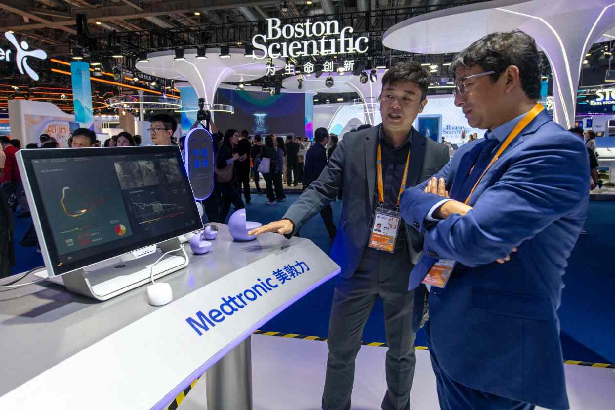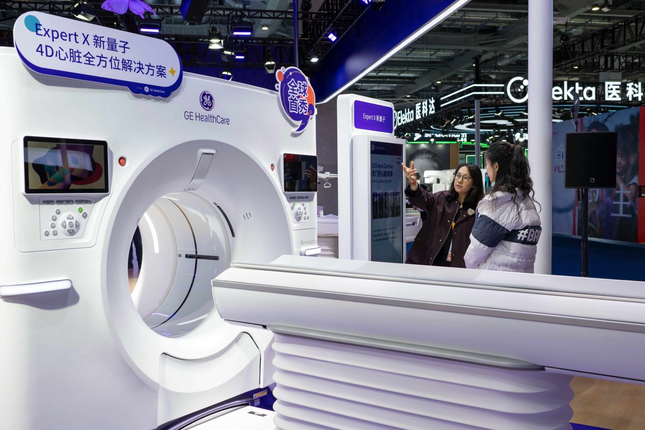 在第八届进博会医疗器械及医药保健展区的GE医疗展台,工作人员正在介绍全球首秀展品。人民网记者 翁奇羽摄