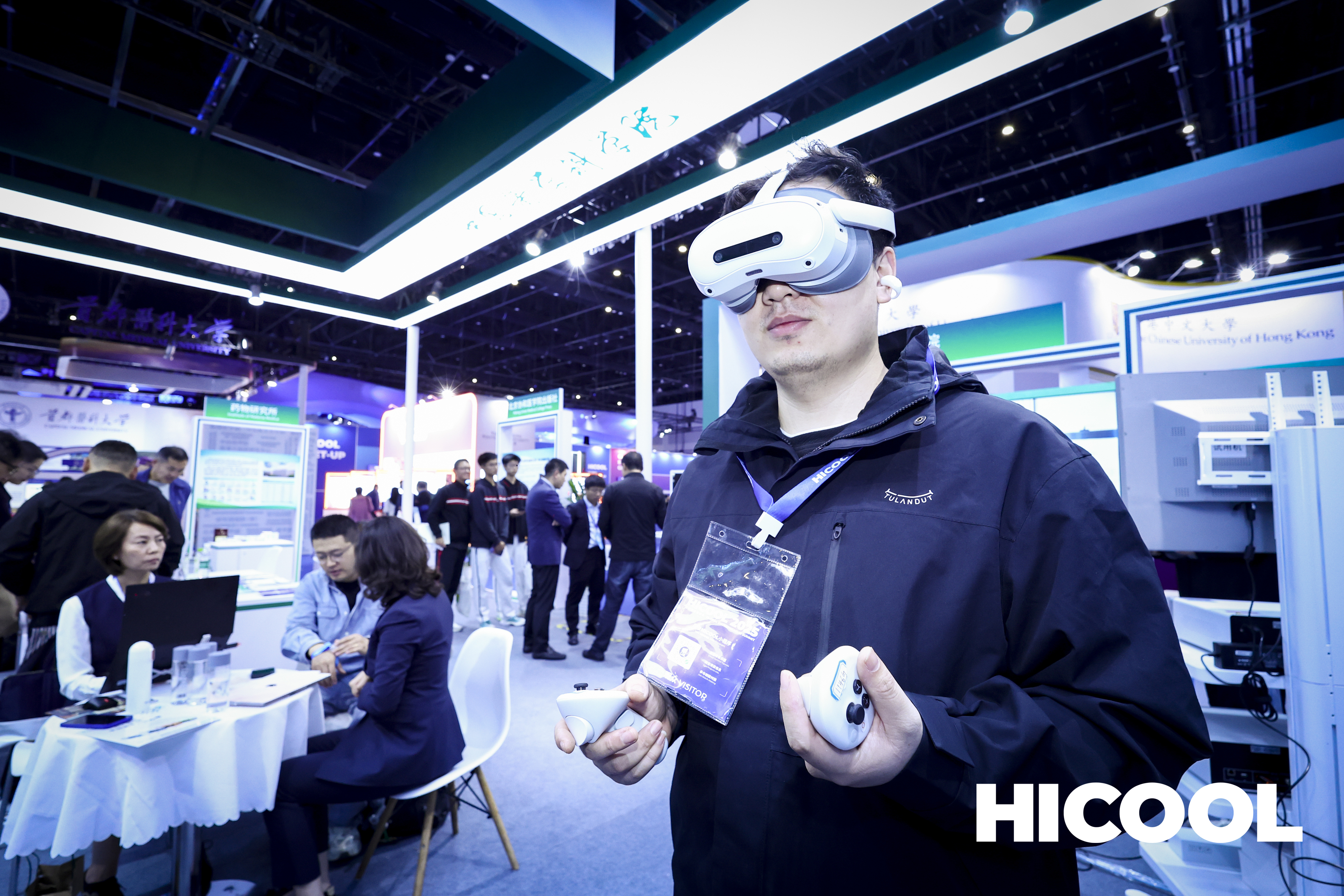 在HICOOL2025峰会生态展区现场体验VR设备的创业者。主办方供图