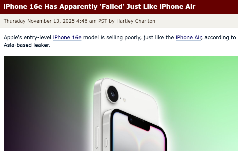 【环球网科技综合报道】11月14日消息,据macrumors报道称,苹果旗下入门级机型 iPhone 16e上市后销量不及预期,其低价iPhone战略再度遭遇挫折,重蹈了iPhone Air的市场覆辙。这一消息打破了该机型发布以来的销售信息沉默,引发行业对苹果中端市场布局的热议。