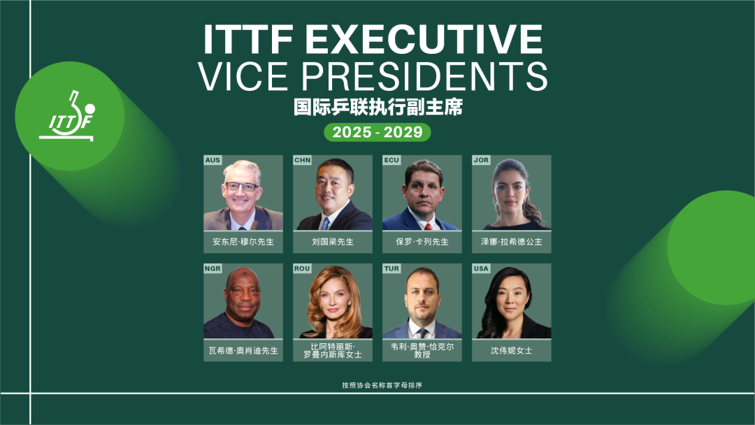 国际乒联全体成员已选出2025-2029年任期的完整执行董事会。以下八位执行副主席,连同今年5月国际乒联年度代表大会第一阶段会议中成功连任的主席佩特拉·索林,将共同履职。其中,刘国梁先生以160票(占投票人数比90.91%)排名第一位,入选执行董事会。