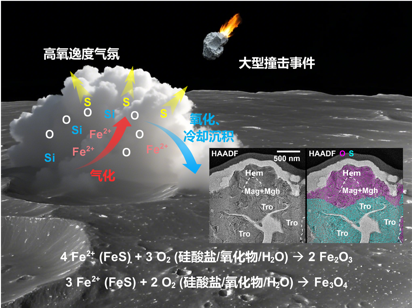嫦娥六号样品中发现的铁氧化物成因示意图。图中表示了月球表面物质在大尺度撞击下气化,产生局部的高氧逸度气氛。高温环境使得陨硫铁(FeS)矿物脱硫,并在适当的温度条件(700~1000℃)下被高氧逸度的气氛氧化,形成了赤铁矿、磁赤铁矿和磁铁矿。