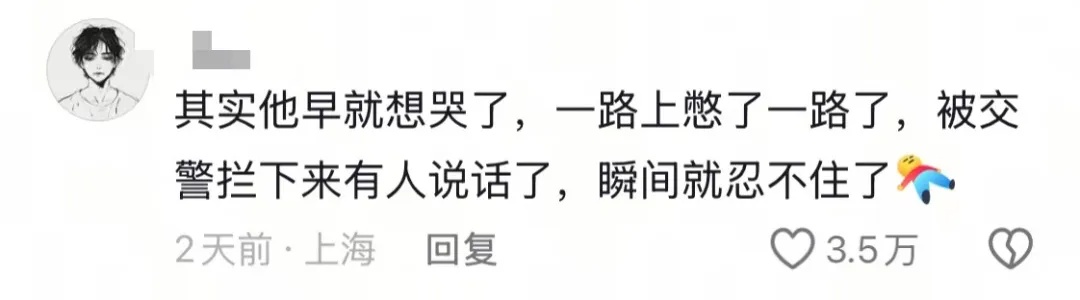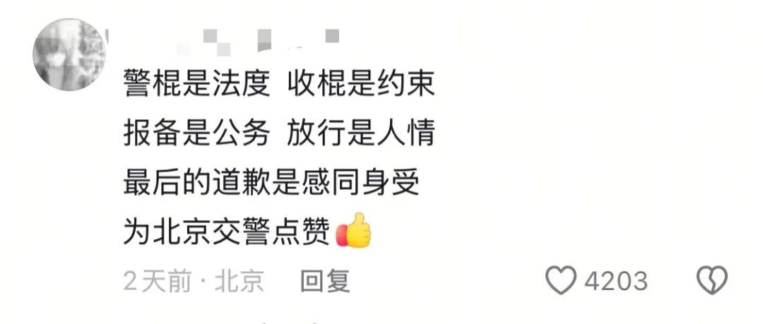 这段经历被宋先生摩托车上的行车记录仪完整记录下来。事后,他将视频发布到短视频平台,迅速引发众多媒体和网友关注。网友评论说:“其实他早就想哭了,一路上憋了一路了,被交警拦下来有人说话了,瞬间就忍不住了。”“警棍是法度,收棍是约束,报备是公务,放行是人情,最后的道歉是感同身受,为北京交警点赞!”