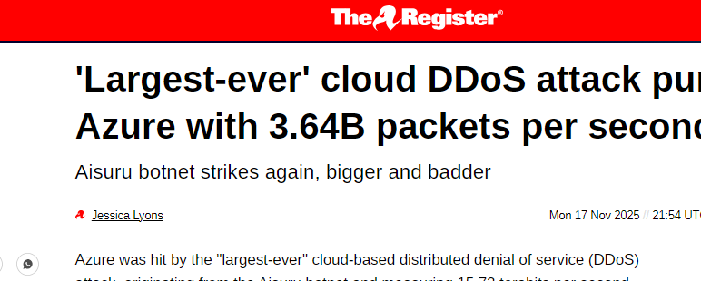 【环球网科技综合报道】11月18日消息,据外媒The Register报道,微软官方披露,其Azure 云服务于10月24日遭遇“云领域史上规模最大”的分布式拒绝服务(DDoS)攻击,峰值流量达15.72太比特/秒(Tbps),数据包峰值近36.4亿包/秒,攻击源为Aisuru物联网僵尸网络。