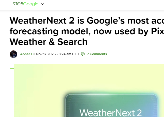 【环球网科技综合报道】11月18日消息,据外媒9to5google报道,谷歌DeepMind与谷歌研究院日前联合推出新一代AI天气预报模型WeatherNext 2,号称“最先进、最高效”,其不仅将预报生成速度提升8倍,还能精准预测低概率灾难性天气,目前已落地谷歌全系消费级应用。