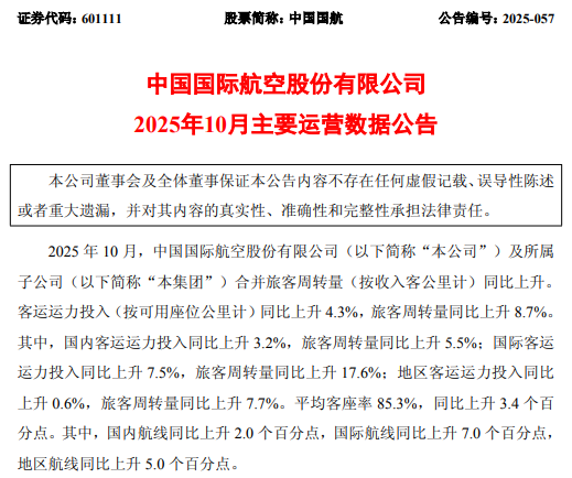 同日,中国东航公布的数据也印证了行业的向好趋势。公司10月客运运力投入同比上升6.84%,旅客周转量同比增幅达到10.58%,客座率高达87.52%,同比提升2.97个百分点。其货邮业务增长更为迅猛,货邮周转量同比大增14.59%。