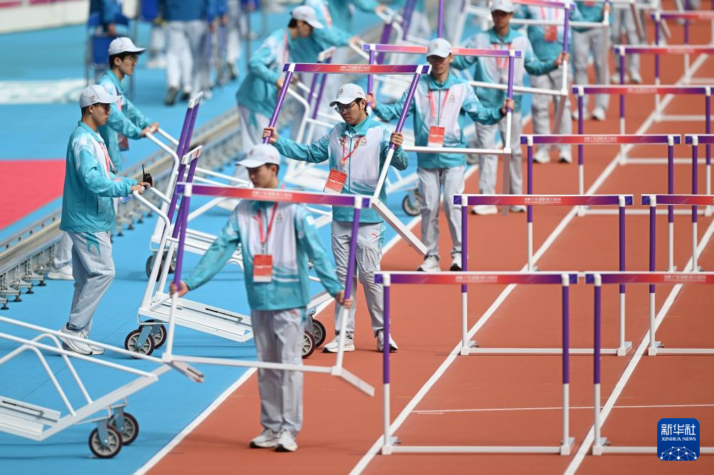 11月19日,志愿者在赛场上搬运跨栏。新华社记者 邓华 摄