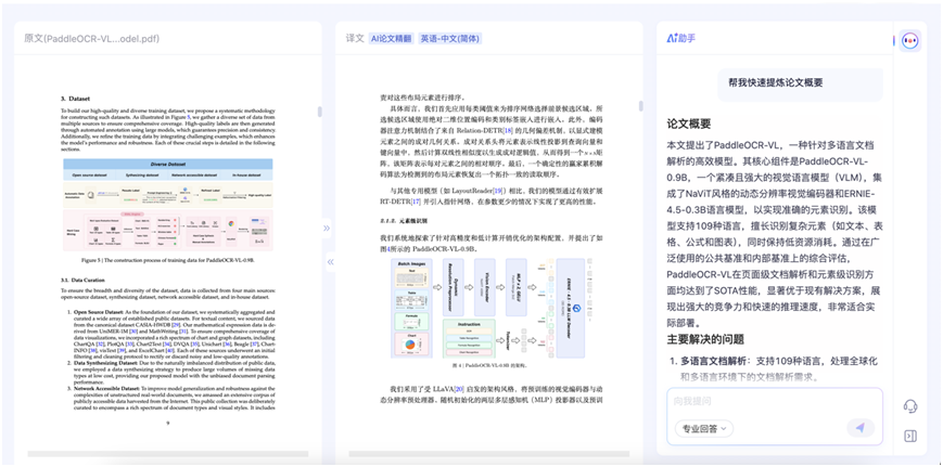 百度文档翻译功能不仅限于翻译本身,AI助手还具有文档问答、总结及译文答疑等功能,大幅提升理解文档的效率。针对学术论文、企业年报、技术报告、合同等复杂长文档,可自动提取文档核心信息,用户无需通读全文即可把握核心。AI助手还支持文档内精准交互,用户可选中任意段落、句子或术语直接提问,AI助手会基于文档上下文、专业知识给出相应解答。