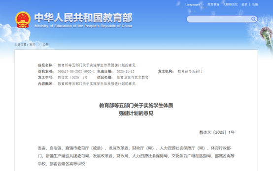 【环球网报道 记者 陈全 实习生 聂希子】记者近日了解到,为贯彻落实《教育强国建设规划纲要(2024—2035年)》,深入实施素质教育,深化学校体育改革,切实增强学生体质,促进学生身心健康,教育部、国家发展改革委、财政部、人力资源和社会保障部、体育总局等五部门联合发布《关于实施学生体质强健计划的意见》(以下简称《意见》)。