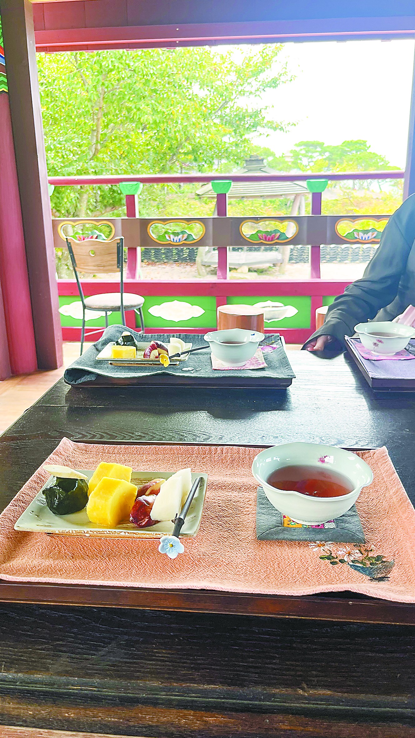 山路不险,车窗外都是静下来的田畴。寺里已备好斋饭,朴素简单的饭菜却很见功夫。茄子片切得整齐,裹上一层薄面炸到金黄,外脆里软;豆腐捏碎,拌上蔬菜做成丸子再用彩椒垫底。最有味道的还是山野菜,搭着豆腐与大酱炖成一锅。还有一道用橡子做的棕褐色小饼,入口有谷物的香气,口感充满韧劲。斋饭下肚,汗意反倒退了下去,只剩稳稳的饭饱后的满足感。