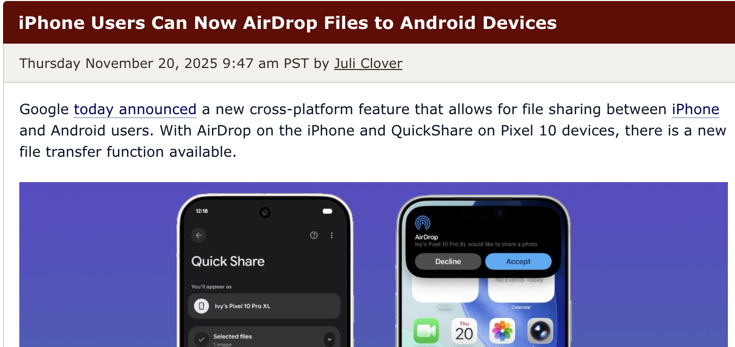【环球网科技综合报道】11月21日消息,据macrumors报道,谷歌推出全新跨平台文件共享功能,实现iPhone、iPad、Mac等苹果设备与Pixel 10系列安卓手机之间的原生文件互传。该功能由苹果的“隔空投送”(AirDrop)与谷歌的“快速分享”(QuickShare)技术共同驱动,两大移动生态在文件传输领域实现深度协同。