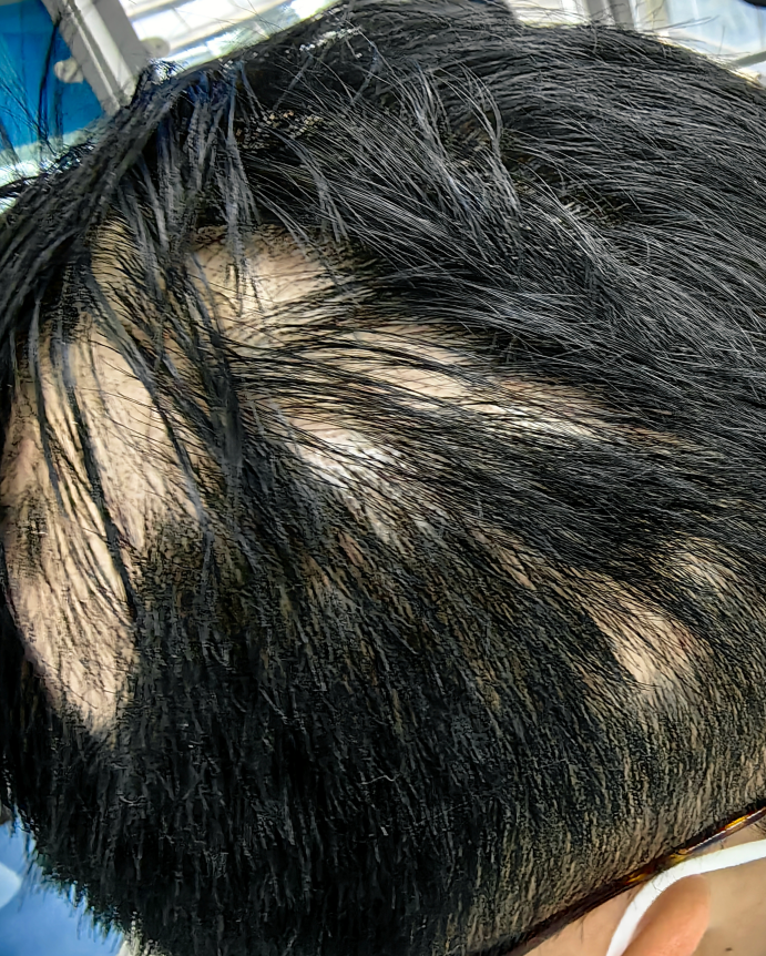 然而,几周后脱发范围逐渐扩大,他开始紧张,于是前往深圳市第三人民医院就诊。该院主治医生检查后指出,他的情况属于“轻中度斑秃”,但具有“进展快、活动度高”的特点,这使得常规治疗初期效果不佳。