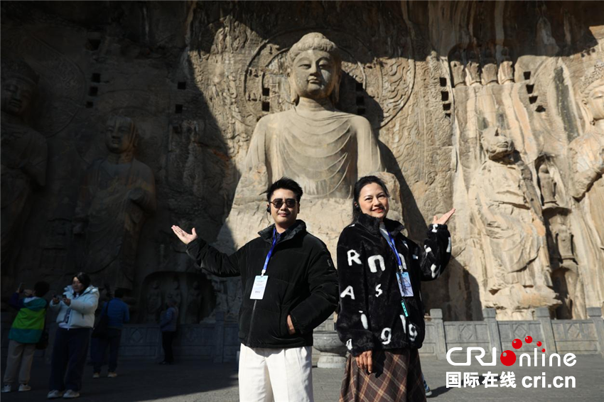 陈慕筠(右)和老挝网红王伟一起打卡龙门石窟
