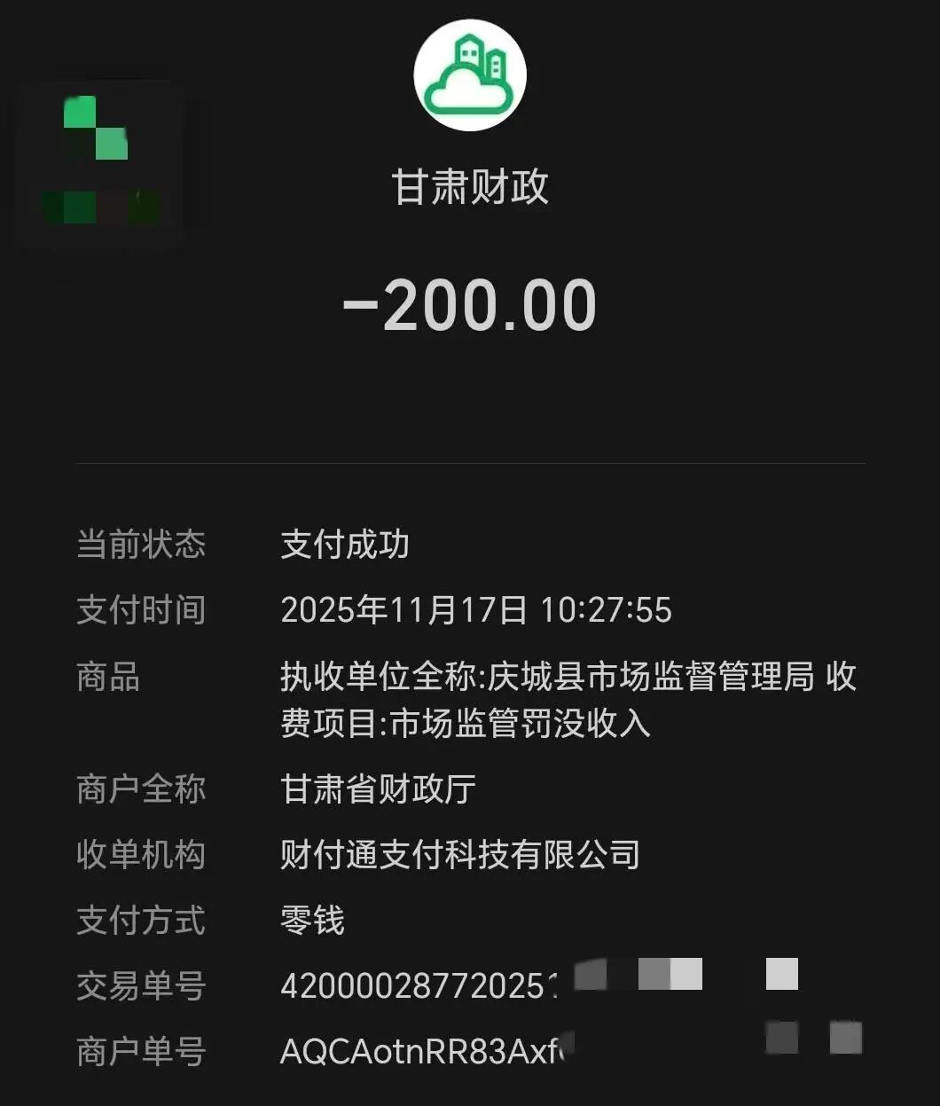 事发后,当地市场监管部门工作人员到店里调查“碰瓷”事件时,顺便在店里查出了与该事件无关的其他小问题,罚款200元。店方200元的支付记录显示,执收单位是庆城县市场监管局,收费项目为市场监管罚没收入。餐馆老板表示,该事件带来的压力很大,不想干了,打算转让餐馆。