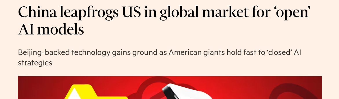 【环球网科技综合报道】11月28日消息,据《金融时报》报道,中国在全球开源人工智能模型市场超越美国,在技术全球应用方面获得了关键优势。