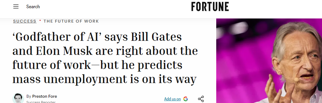 【环球网科技综合报道】12月5日消息,据《财富》报道,有“AI教父”之称的杰弗里・辛顿近期公开表态,认同比尔・盖茨与埃隆・马斯克对AI重塑工作场景的判断,并警告AI或引发大规模失业,数百万劳动者将被时代抛弃。