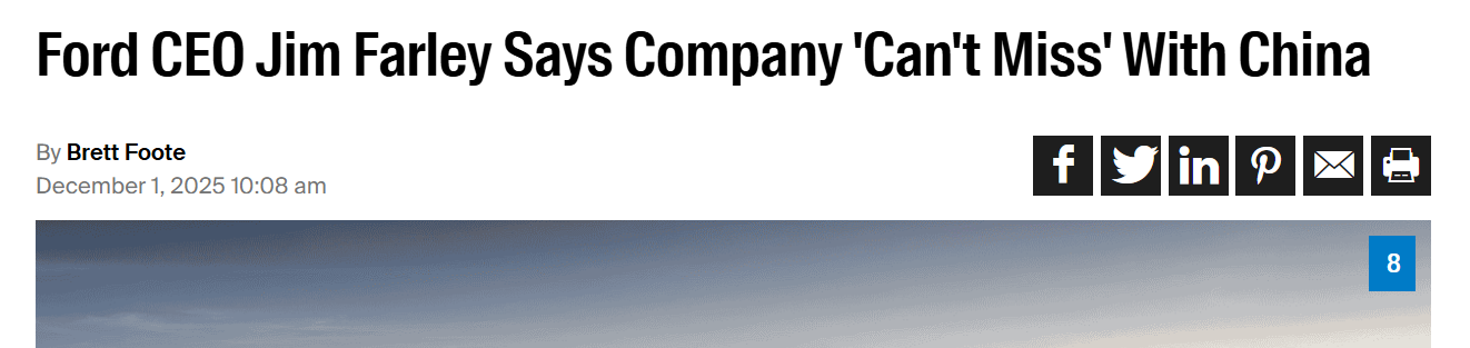 【环球网科技综合报道】12月3日消息,据Ford Authority报道,福特首席执行官吉姆·法利最近表示,“福特错过了日本市场,错过了韩国市场,我们不能再错过中国市场。”