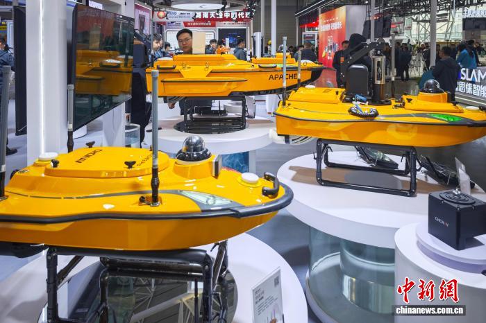 12月4日,以“融创新·拓边界·共绘地理信息新篇章”为主题的中国测绘地理信息技术装备展览会在南京国际展览中心开幕,汇聚全产业链力量,设立智能装备与高端传感器、实景三维与数字孪生技术、地理信息安全与自主可控、空天地海一体化监测、地理信息+行业应用解决方案五大展区,集中展示前沿技术、拓展应用边界、深化国际合作,为产业高质量发展注入新动能。图为观众在展厅内参观展出的无人船。中新社记者 泱波 摄