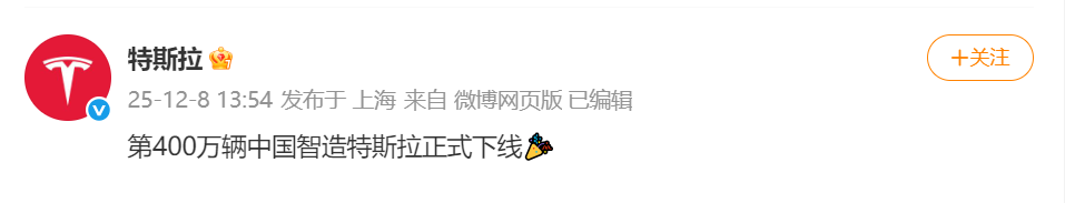 特斯拉表示,“从 300 万到 400 万,只用了不到 14 个月。6 年间,上海超级工厂贡献了特斯拉全球近一半的电动车交付量。”