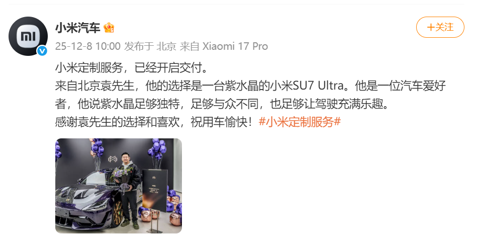 【环球网科技综合报道】12月8日消息,小米汽车宣布,小米定制服务已经开启交付。小米汽车称,“来自北京的袁先生,他的选择是一台紫水晶的小米 SU7 Ultra。他是一位汽车爱好者,他说紫水晶足够独特,足够与众不同,也足够让驾驶充满乐趣。”