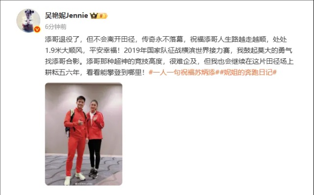 添哥退役了,但不会离开田径,传奇永不落幕,祝福添哥人生路越走越顺,处处1.9米大顺风,平安幸福!2019年国家队征战横滨世界接力赛,我鼓起莫大的勇气找添哥合影。添哥那种超神的竞技高度,很难企及,但我也会继续在这片田径场上耕耘五六年,看看能攀登到哪里!