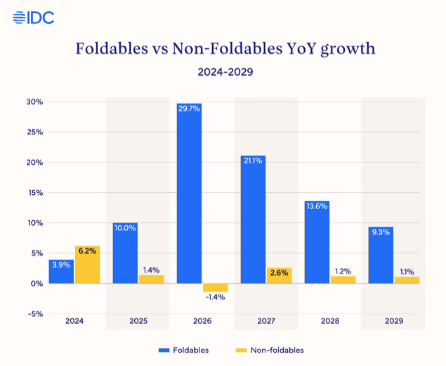 展望长期趋势,折叠屏手机的复合年均增长率(CAGR)在 2029 年前将保持在 17%,远超传统智能手机不足 1% 的增速,届时折叠屏产品将占据智能手机市场总产值的 10% 以上。