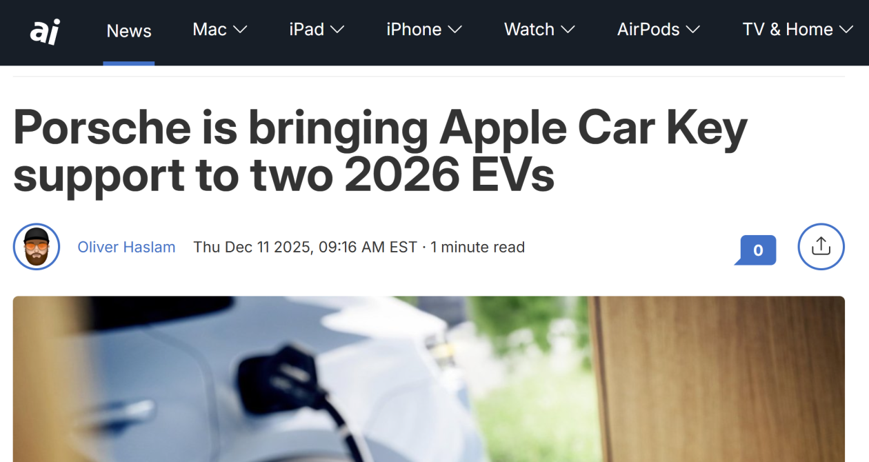 【环球网科技综合报道】12月12日消息,据科技媒体Appleinsider报道,保时捷(Porsche)官方近日宣布,计划于2026年推出的纯电动卡宴(Cayenne)与Macan两款车型,将正式引入苹果数字车钥匙(Apple Car Key)功能。这一举措标志着保时捷在智能出行领域的重要布局,为用户带来更便捷、高效的用车体验。