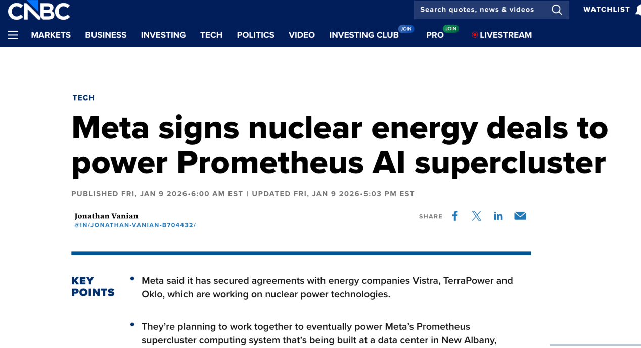 与Vistra、TerraPower及Oklo等核能技术公司达成的合作,将为Meta位于俄亥俄州新奥尔巴尼数据中心的Prometheus超级计算集群提供动力。协议的具体财务条款未予披露。